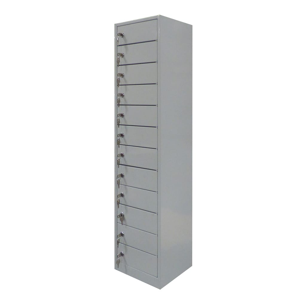 Consigna con carga para dispositivos electrónicos, ideal para centros educativos, oficinas o espacios públicos que requieren soluciones seguras y funcionales para el almacenamiento y recarga simultánea.