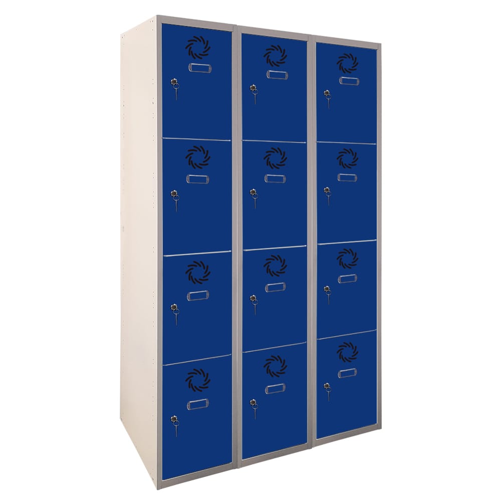 Taquilla metálica de 3 cuerpos, 4 puertas y 300 mm de anchura por columna. Fabricada en acero reciclable, combina resistencia, funcionalidad y sostenibilidad para un uso intensivo.