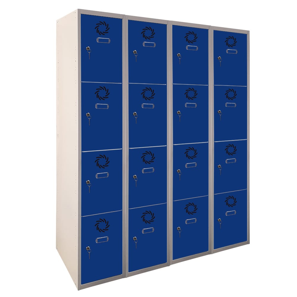 Taquilla metálica de 4 cuerpos, 4 puertas y 300 mm de anchura por columna. Fabricada en acero reciclable, combina resistencia, funcionalidad y sostenibilidad para un uso intensivo.