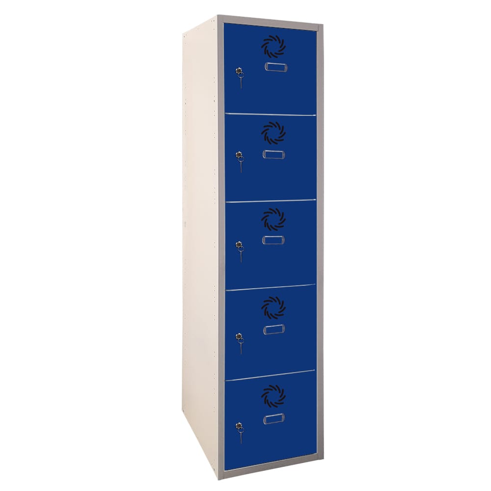 Taquilla metálica de 1 cuerpo, 5 puertas y 400 mm de anchura por columna. Fabricada en acero reciclable, combina resistencia, funcionalidad y sostenibilidad para un uso intensivo.