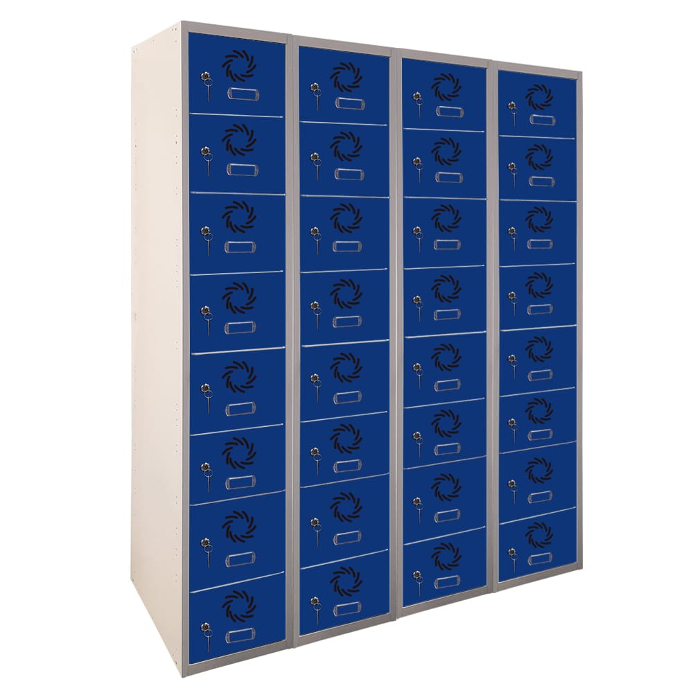 Taquilla metálica de 4 cuerpos, 8 puertas y 300 mm de anchura por columna. Fabricada en acero reciclable, combina resistencia, funcionalidad y sostenibilidad para un uso intensivo.
