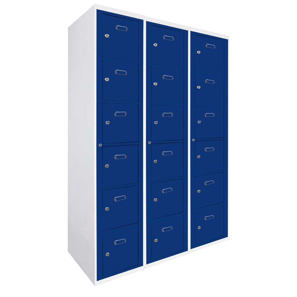 Taquilla metálica soldada multipuerta con 6 puertas enmarcadas por cuerpo. Diseñada para maximizar el almacenamiento en espacios reducidos, combina resistencia, accesibilidad y estructura modular en acero reciclable.